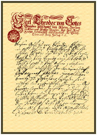 "Wir Carl, Theodor, von Gottes Gnaden Pfalzgraf bei rhein, Herzog in ober und nieder baiern, des heiligen römischen reichs erztruchseß und Churfürst in den Landen des rheins, schwaben und fränkischen rechtes, darmaliger Fürseher und vicarius zu Gülis, Kleve und Berg, Herzog, Landgraf zu Leuchtenberg, Fürst zu Mörs, Marquis zu Bergen... zu Verldenz, Sponheim, der Marck und Ravensberg, herr zu ravenstein etc, etc...